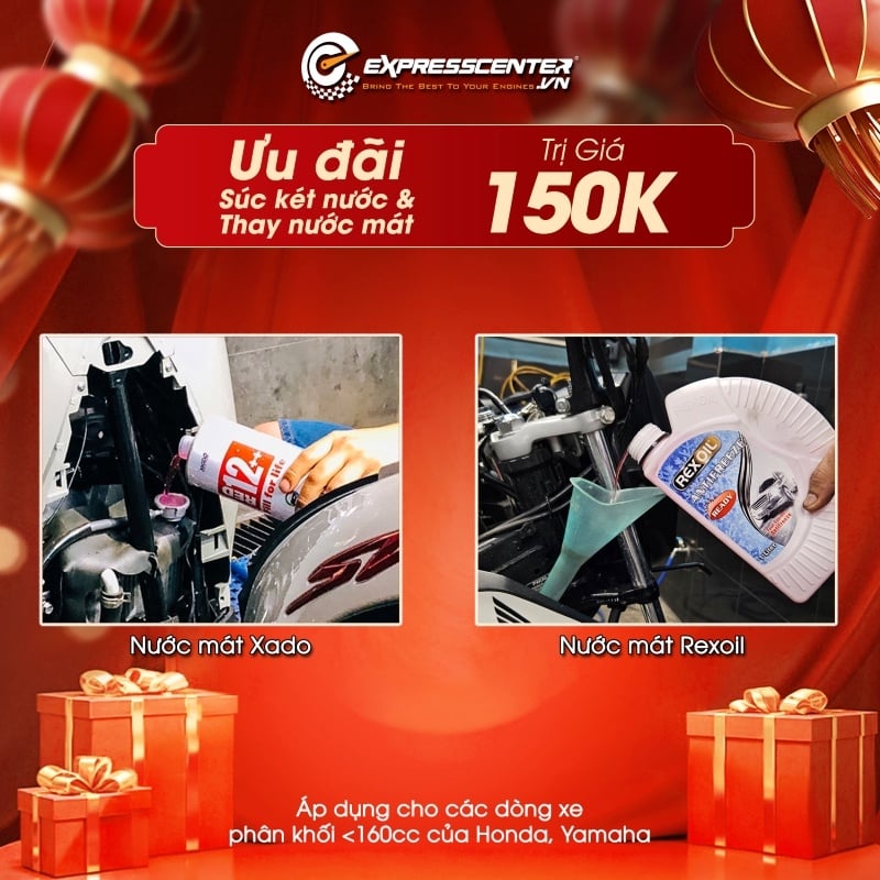 Trong chương trình lần này, Express Center sẽ mang đến cho khách hàng cơ hội trải nghiệm nước làm mát nhập khẩu chất lượng từ các thương hiệu nổi tiếng trên thị trường như XADO hoặc Rexoil với mức giá "hạt dẻ" chưa từng có. Chỉ 150.000đ trọn gói cho quy trình súc két và thay nước mát. (Áp dụng cho các dòng xe phân khối <160cc của Honda, Yamaha)