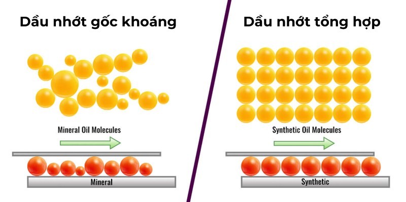 Trong khi đó, nhớt khoáng (Mineral) được chế tạo từ dầu thô qua quá trình chưng cất và tinh chế, do đó cấu trúc phân tử của nó không đồng nhất. Điều này khiến dầu nhớt dễ bị phân tách trong điều kiện nhiệt độ cao, làm giảm khả năng bôi trơn và hiệu suất hoạt động.